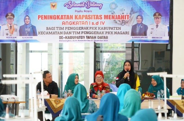 Batusangkar-Tanah Datar, Guna meningkatkan pengetahuan dan upaya pemberdayaan serta menciptakan kaum perempuan yang produktif, Tim Penggerak Pemberdayaan dan Kesejahteraan Keluarga (TPPKK) Tanah Datar yang dimotori Pokja II menggelar pelatihan menjahit baju yang dibuka resmi Ketua TPPKK Ny. Lise Eka Putra,SE, Sabtu (22/11/2025) di Gedung Promosi Daerah Tanah Datar di Batusangkar.
