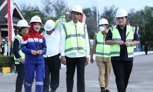 Presiden Jokowi bersama Dirut Pertamina (Persero) Nicke Widyawati, Menteri BUMN Erick Thohir dan Menteri PUPR Basuki Hadi saat berkunjung ke fasilitas PHR WK Rokan. |