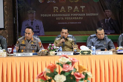 PEKANBARU - Sejumlah topik jadi bahasan dalam Rapat Kordinasi Pimpinan Daerah (Forkopimda) Kota Pekanbaru, Senin (27/2). Pj Wali Kota Pekanbaru Mulfihun ikut dalam rapat yang berlangsung di Ruang Zapin, Mapolresta Pekanbaru.